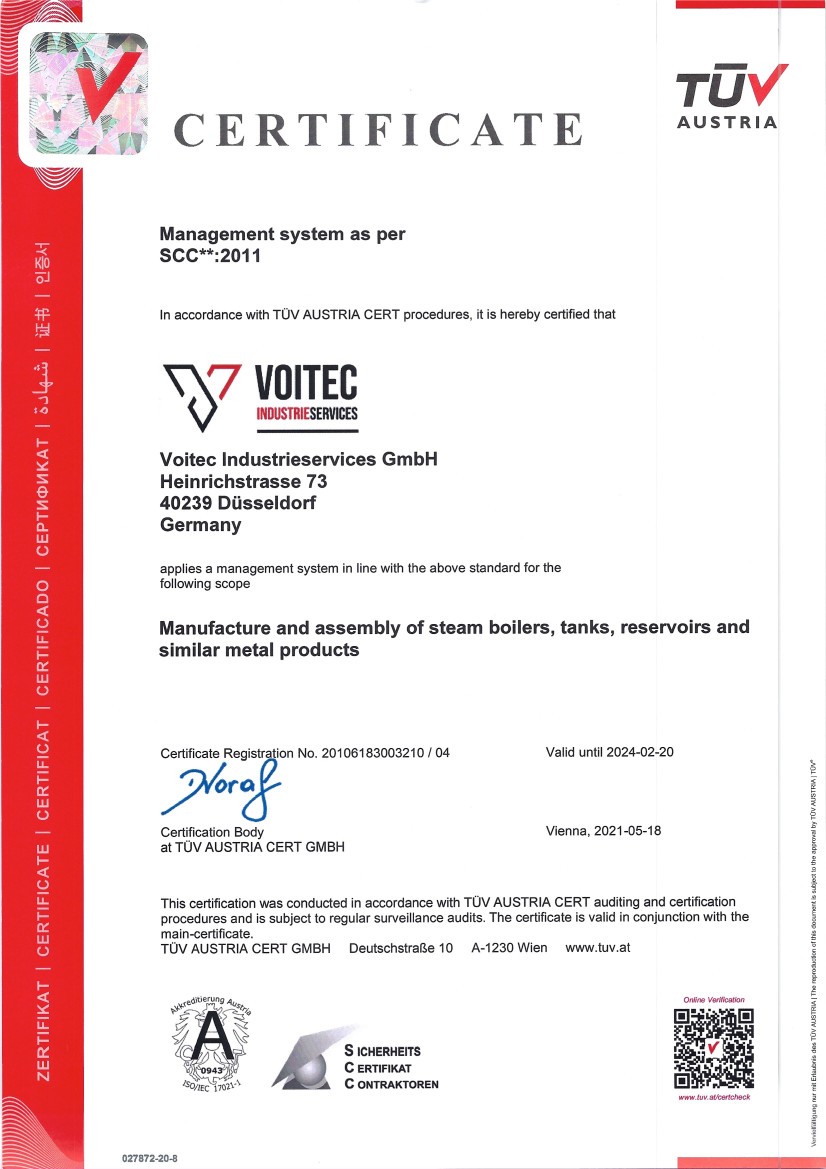 We have all relevant safety certificates. Besides of SCC** and OHSAS 18001 certificate, Voitec Industrieservices owns licenses and certificate for construction and welding technique.